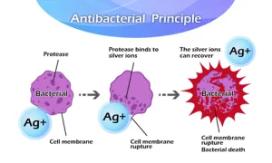 When bacteria or germs touch the surface of the product, the silver ions on the product surface will contact the cell membrane of the bacteria or germs. The silver ions will undergo a biochemical reaction with the protease of the cell membrane, resulting in biological inactivation (bioinactivation). During the reaction of the two, silver ions will quickly and effectively destroy bacteria and germs; afterward, silver ions will be released from dead bacteria and germs, and then continue to carry out repeated biochemical reactions to other contacting live bacteria and germs until the bacteria and the germs are eliminated. As shown in Figure 2. The effect of silver ions is a long-term bactericide with a long-lasting effect.