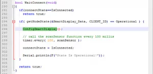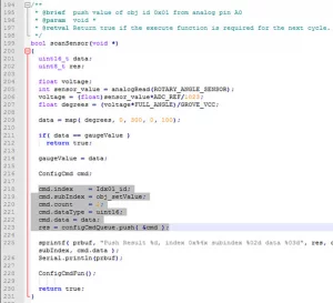 3.3 When the Arduino host receives the value change from the physical Rotary Angle Sensor. It will send certain value to the SmartDisplay through the protocol of CANopen. Please refer to the following program for key points « command structure ids and sub-indexes ». The purpose of this program is to update the Gauge (object index 0) value according to the value changed from the physical Rotary Angle.