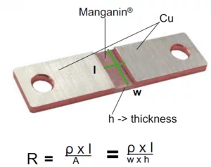 The resistance of the shunt resistor is a function of the resistivity (ρ) of the alloy, the length of the resistor, and its cross-sectional area. Manganin® has a resistivity of 43 µΩcm; pure copper, by comparison, has a ρ value of 1.7 µΩcm.