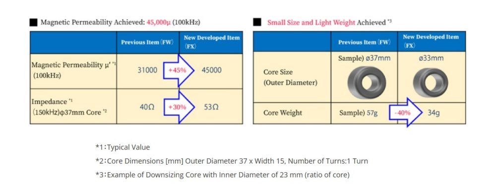 The FX Series has achieved a high permeability of 45,000µ (which is unique amongst nanocrystalline material cores) and high impedance characteristics in high frequency ranges. Both are very effective for downsizing and improving countermeasures for noise regulations. In other words, the FX Series can offer noise filters with the same performance but in a smaller size than conventional products.