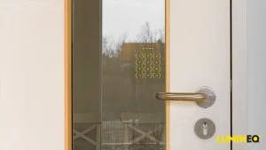 A traditional keypad lock is installed on top of the door surface as an extra object. But LUMINEQ powered transparent touch keypad can be seamlessly integrated into the glass door or window.
