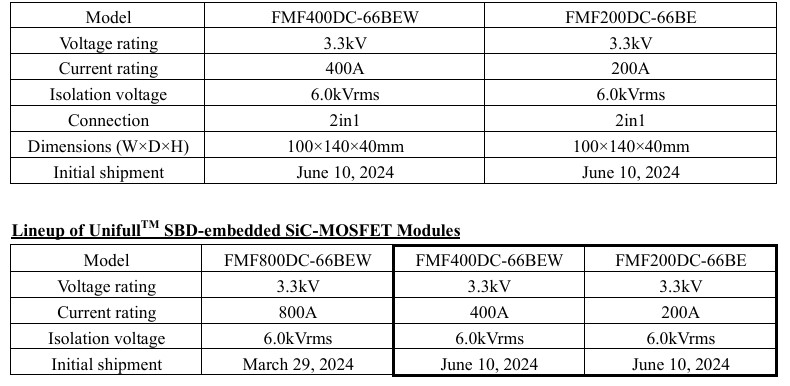 Mitsubishi Electric announced that it has begun shipping low-current 3.3kV/400A and 3.3kV/200A versions of a Schottky barrier diode (SBD) embedded silicon carbide (SiC) metal-oxide-semiconductor field-effect transistor (MOSFET) module for large industrial equipment, including rolling stock and electric power systems. Together with the existing 3.3kV/800A version, the newly named UnifullTM series comprises three modules to meet the growing demand for inverters capable of increasing power output and power conversion efficiency in large industrial equipment.