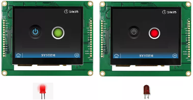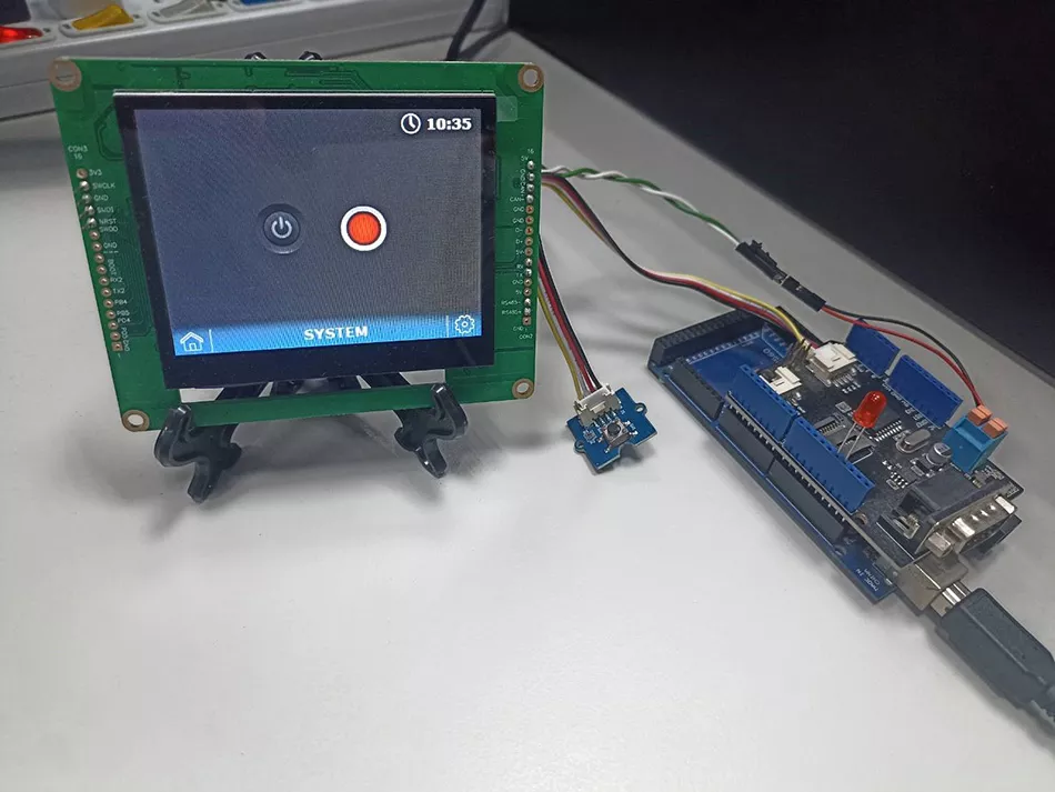 To demonstrate a demo scenario is created. A touch button is placed on the screen and a physical button is used aswell. Pressing either the physical button or the touch button will change the color of the indicator on the screen and turn the external LED on or off.