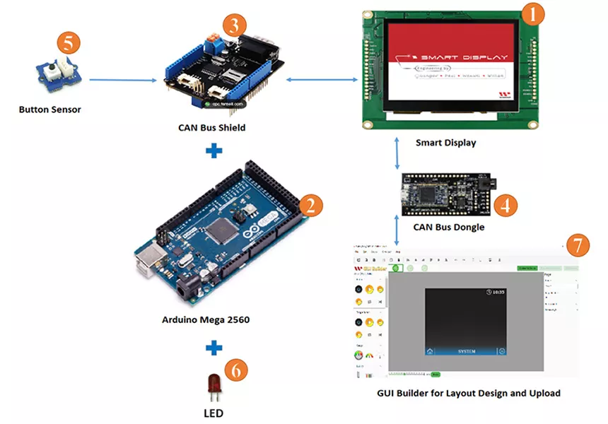 A 3.5-inches Smart Display standard product is used. This application file explains how to modify the program and add control Physical buttons, touch buttons, indicators on the screen and a LED on board. It also explains how commands are received from a host controller. The host is an Arduino mega 2560 board with a CAN Bus shield.