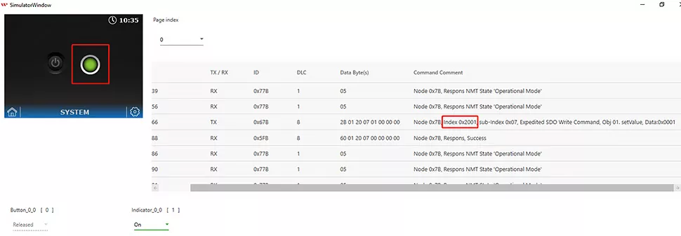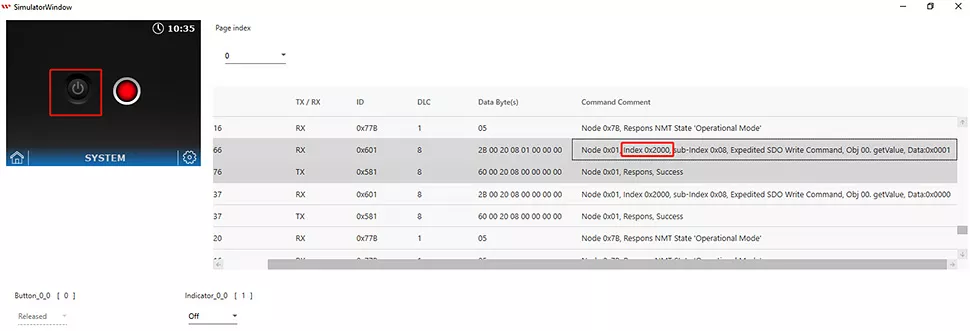 The index of the Button style corresponds to 0 (0x2000) and the index of the Indicator style corresponds to 1 (0x2001) is defined in the CAN open structure. It is important to take note of an object’s index. An object’s status can be changed while programming in the Arduino host if its index is known, showing as below in the Fig of simulation logs table.