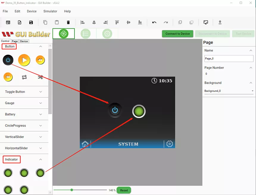 For the demo scenario, add a button and an Indicator from the control section. Select, drag, and drop.