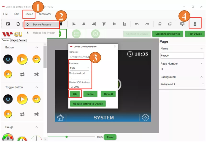 When all previous steps are completed and the layout design is created. Now it’s time to build the project. Go to the Device button and select Device Properties. Select the default settings of the baud rate or choose according to your requirements. You do have the flexibility to adjust the baud rate to meet your specific needs. But it highly recommends that you set the baud rate in both your Arduino code and the GUI builder to the same value. Finally, click on the upload button to upload this project as shown below.