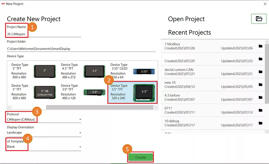 First of all, open an updated GUI builder to create a new project, type the any project name and check the project folder which is auto-selected by default. Then select the device type, in this case 3.5 “. Select the protocol, let the display orientation be by default landscape mode. Select blank in the UI Template and finally click on the create button to create your new project, as shown: